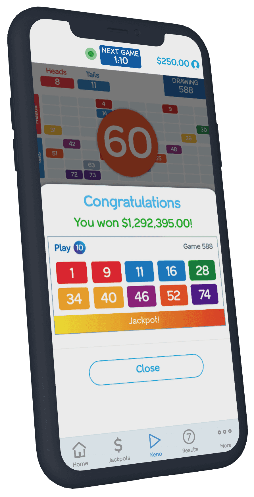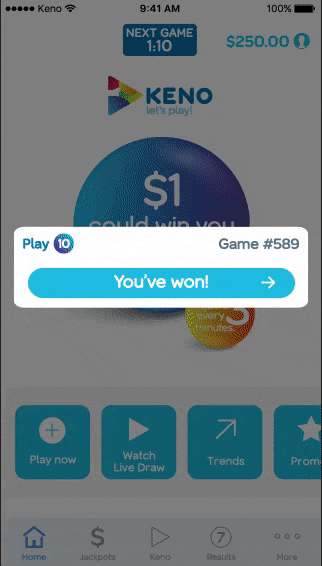 Keno is a lottery product, so naturally an enormously important part of the experience is when you win. Many users had told us that the winning experience was often underwhelming - so much so that they often missed the fact that they'd even won.