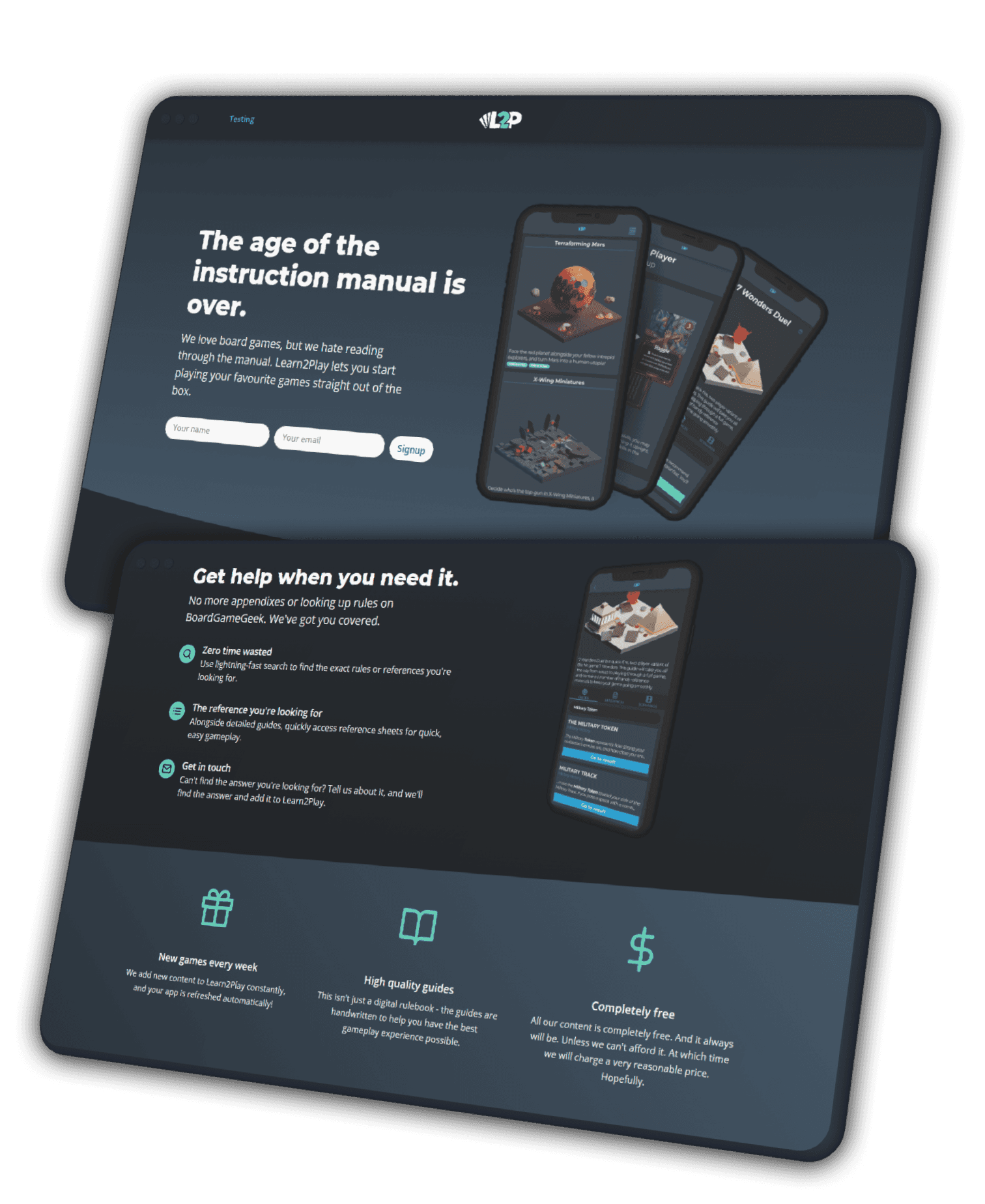 So that users could discover what Learn2Play was about on their own, I put together a product site that explained the core use of the app. This site also included instructions on signing up for testing, which was essentially it's real purpose. You can actually visit the site, and sign up to test the app, here.