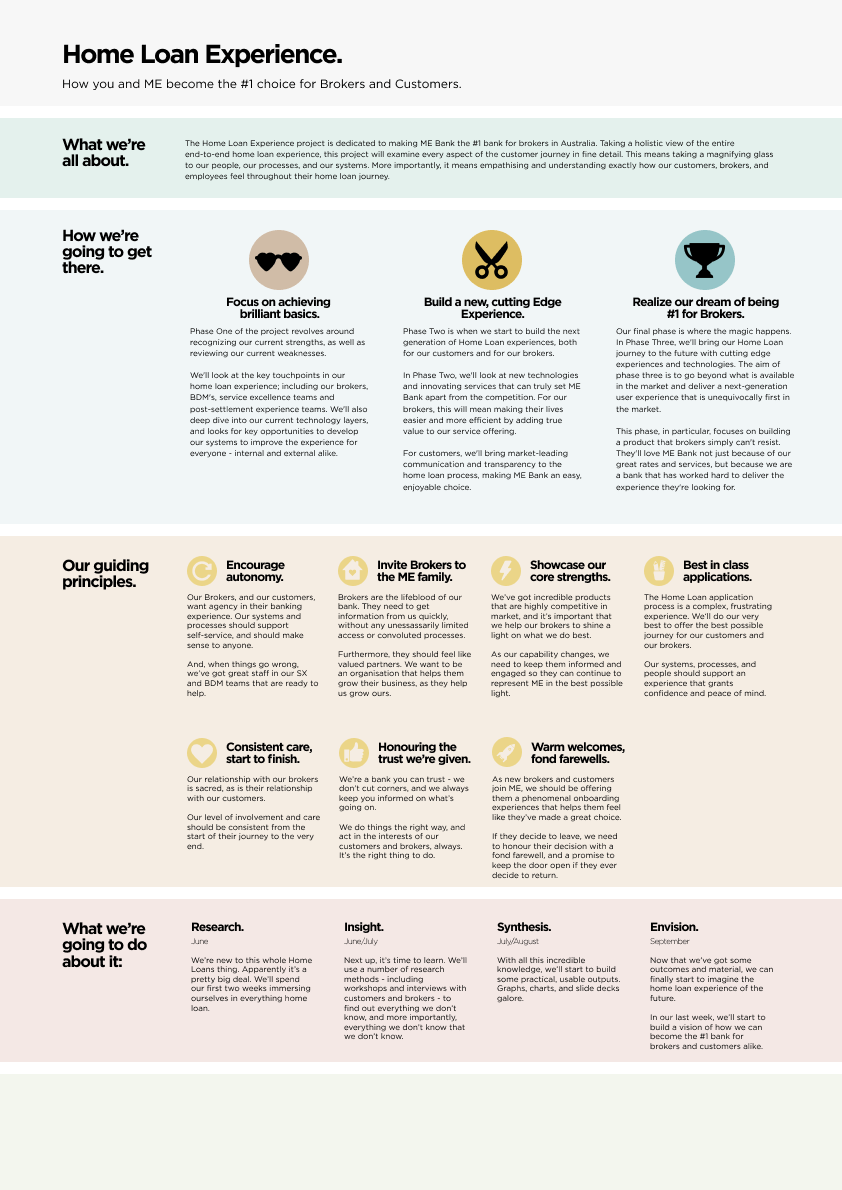 My team and I joined ME Bank with the mission statement to help the bank identify how to become a first-choice bank for mortgage brokers. We were given full creative control on how we accomplished this outcome, and so immediately began planning how we could execute the work. We knew that it would be vital to be able to communicate not just the outcomes, but also the journey of how we came to our conclusions. We also understood that there would likely be a number of complex solutions requiring coordination across the business.