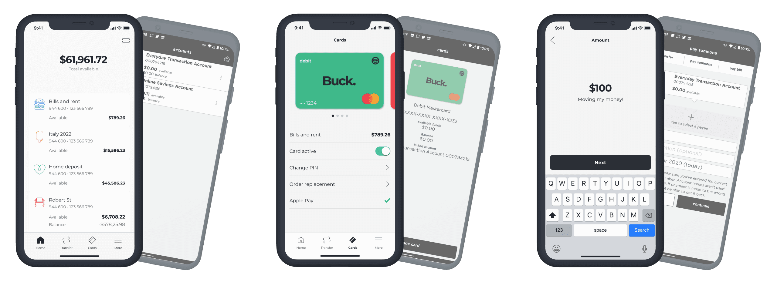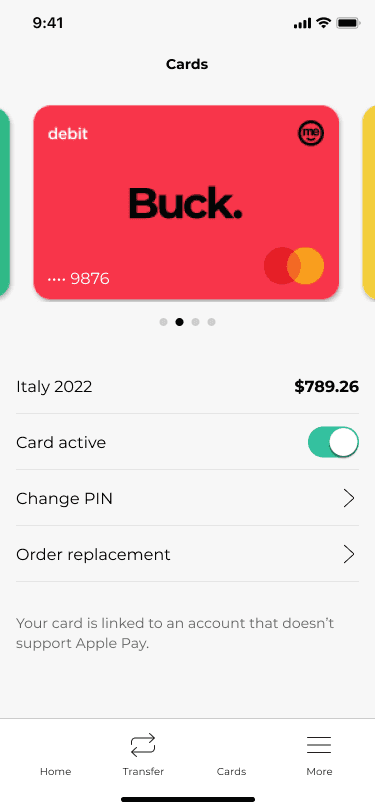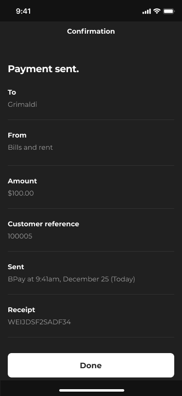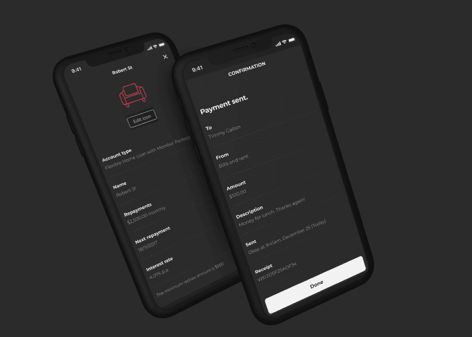 ME Bank has traditionally stuck to a black and white colour scheme, but many complaints from customers on the App Store and Play Store identified that they'd prefer more colour and excitement. This was a core focus for us as we moved through the screens - retaining our monochromatic look and feel, but injecting some vibrancy where we felt it had an impact.