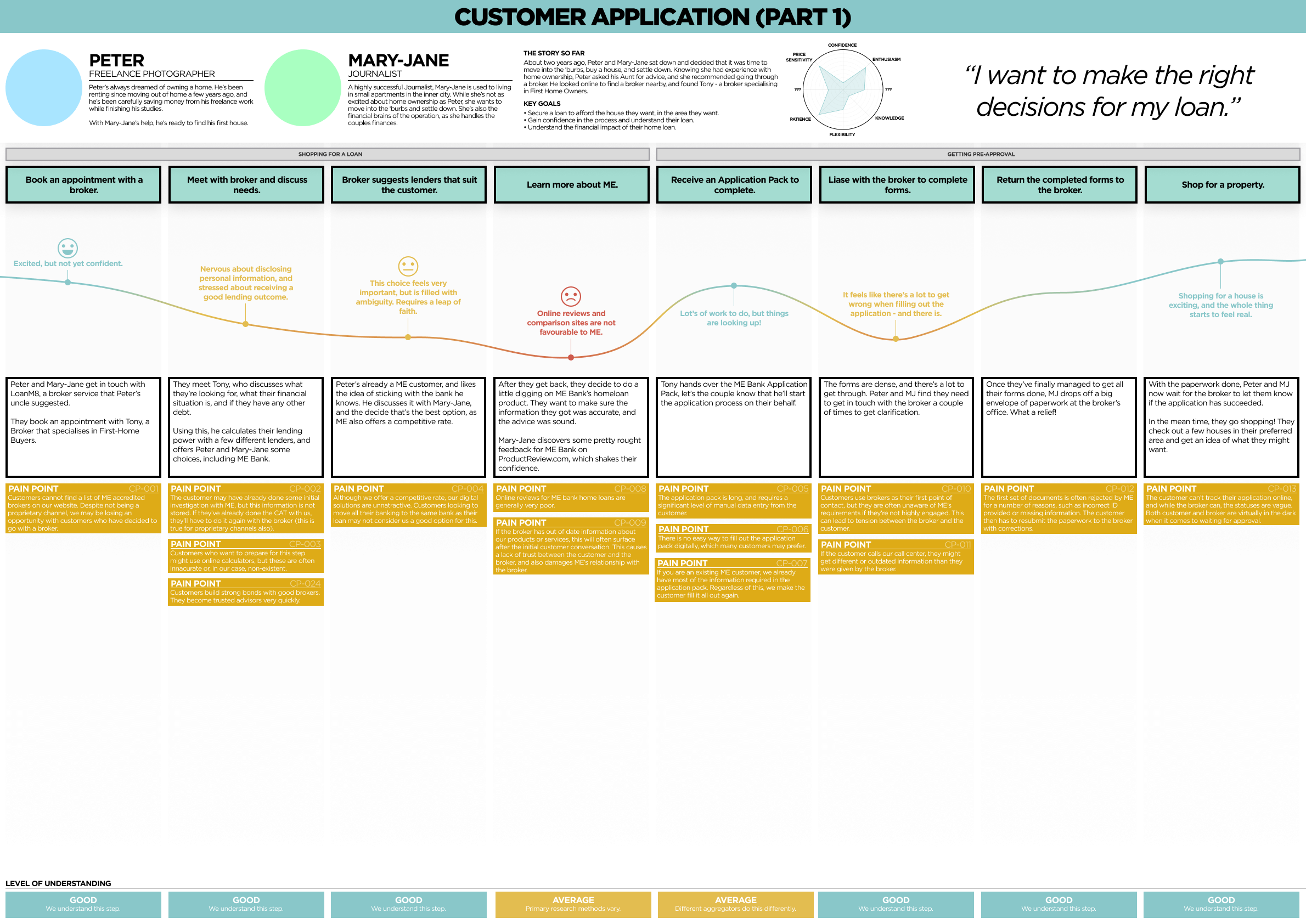From these interviews, we created complex user journey maps. These maps also combined with some process and service mapping, giving us a holistic view of what's happening with the customer, broker, and ME Bank at any point in the process.
