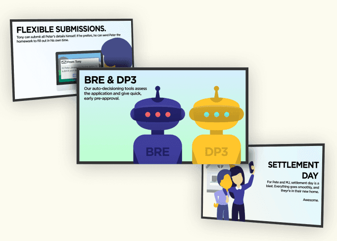 The presentation itself was a combination of ME Bank's brand look and feel, and my personal design style. I used basic illustrative assets to convey the story where possible, and paired these with simplified, quick language. The point of this presentation was not to convey the technical of logistical challenges, but simply to help our audience empathize with our customers.
