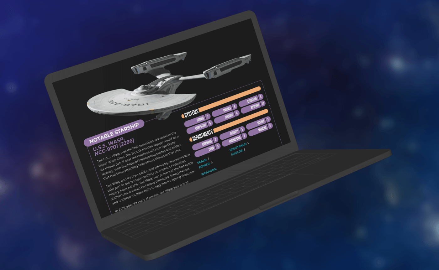 During COVID, I really enjoyed playing online tabletop roleplaying games with my friends. Star Trek Adventures was a relatively new release, and as such had no dedicated way to be played online. As an expert in Figma, I knw that it had the capabilities to be used in this way - I just had to design something that was user-friendly enough that even someone brand new to Figma could jump in and use it.
