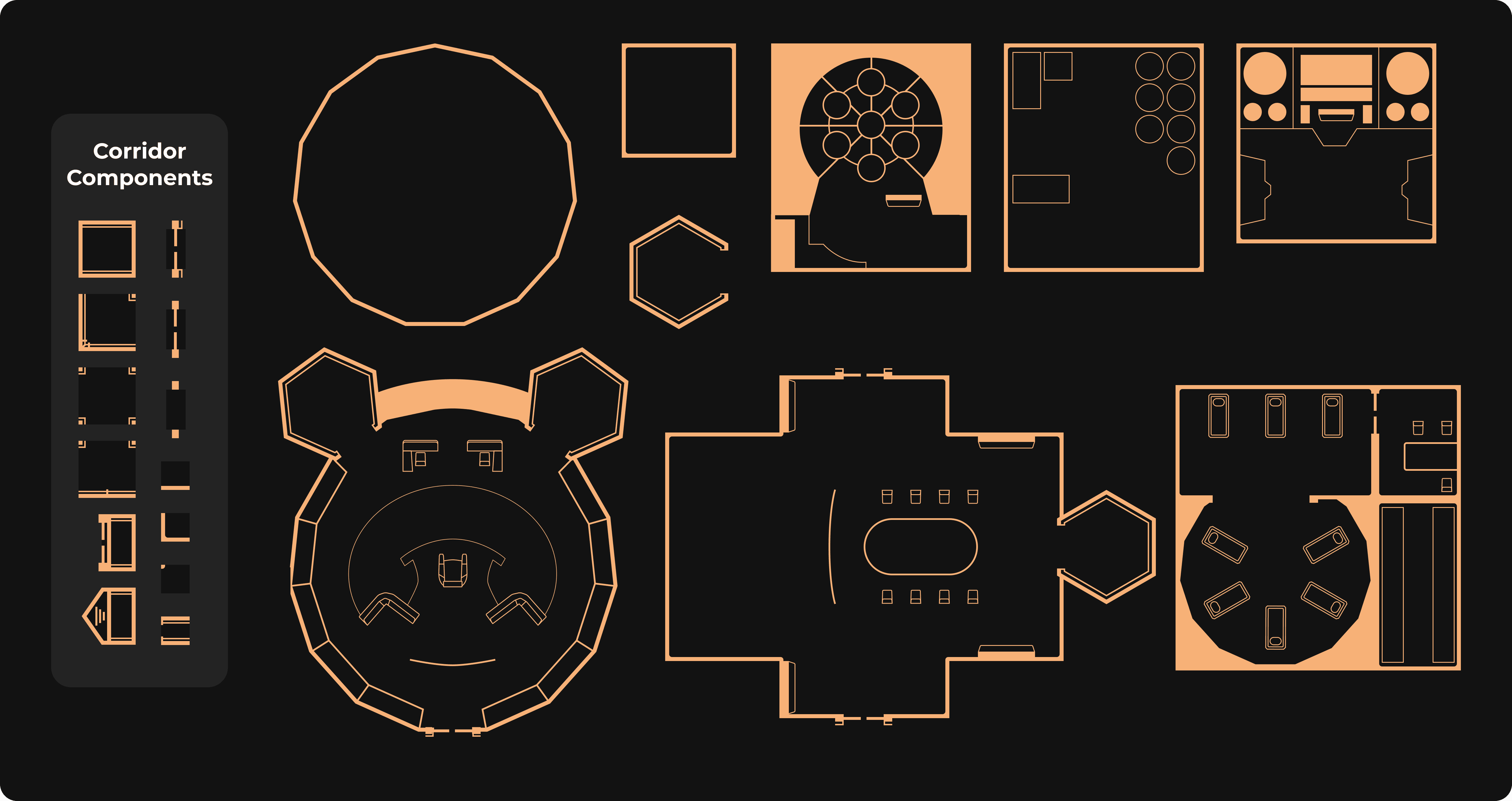 So that I could quickly generate my own maps that suited the style of our visuals, I created a library of basic map components that I could quickly put together to build rooms and areas for my players to play it.