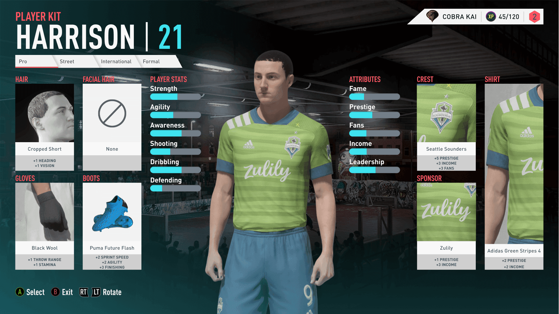 I began by working on a character customisation screen that would harken to those you might see in a role-playing game, but with a keen focus on keeping the football feel and FIFA aesthetic.